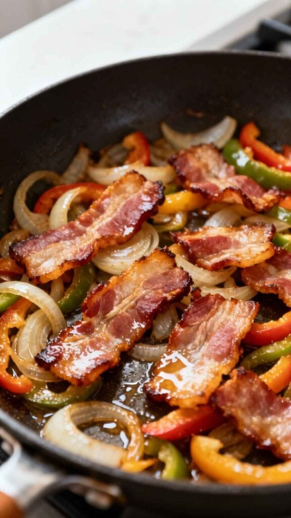 - Soften the vegetables. Add the diced onion and bell pepper to the skillet with the bacon drippings. Sauté for 4–5 minutes until softened and lightly golden. Turn off the heat and let them cool slightly.1 Small Diced Yellow Onion, 1 medium diced Bell pepper