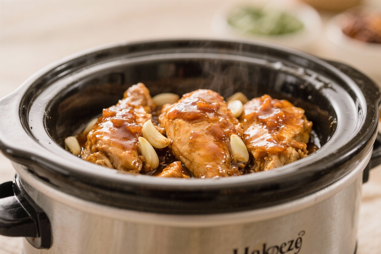 Set and cook: Cover and cook on Low for 4–5 hours or High for 2–3 hours, until the chicken is tender and easily pulls apart but not overcooked.